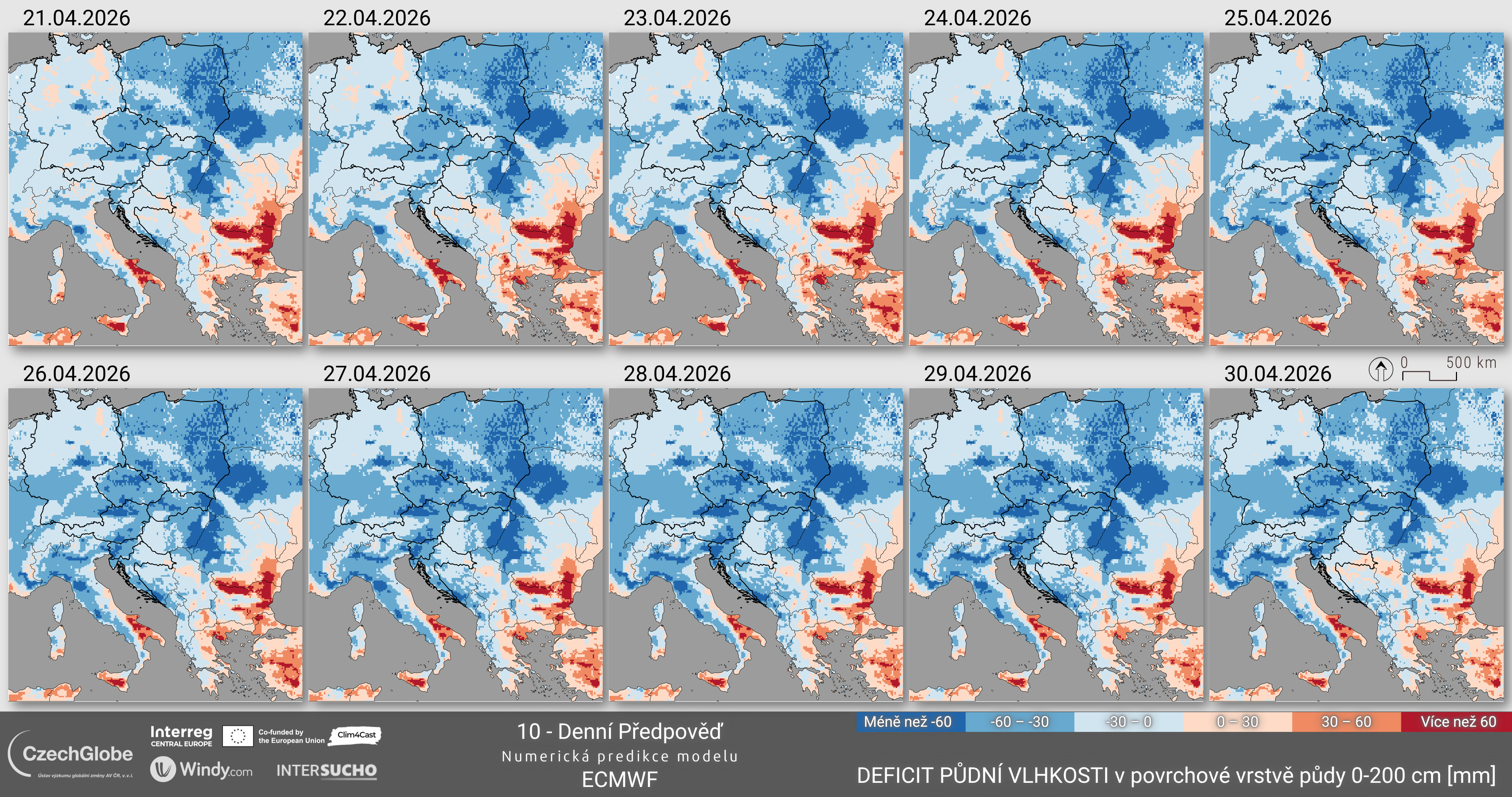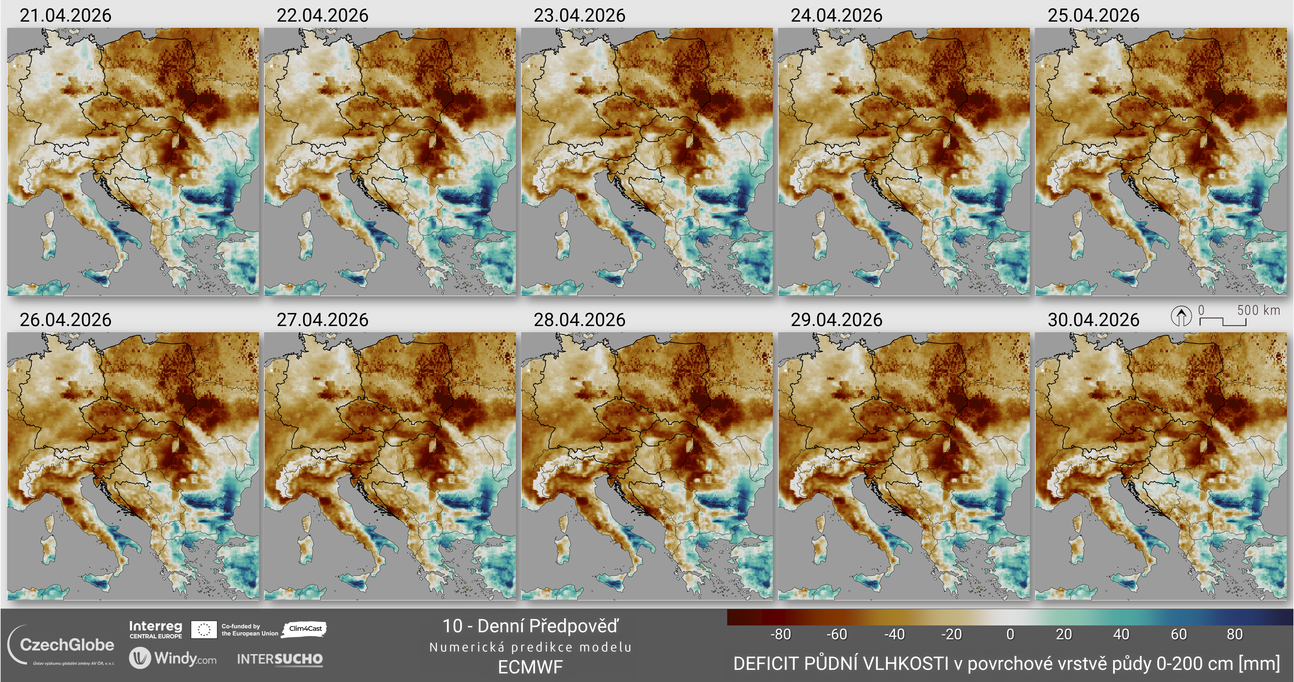 Vrstva anomálií půdní vlhkosti (na základě modelu vodní bilance SoilClim) představuje odchylku půdní vlhkosti od dlouhodobého mediánu referenčního období 1961-2010.