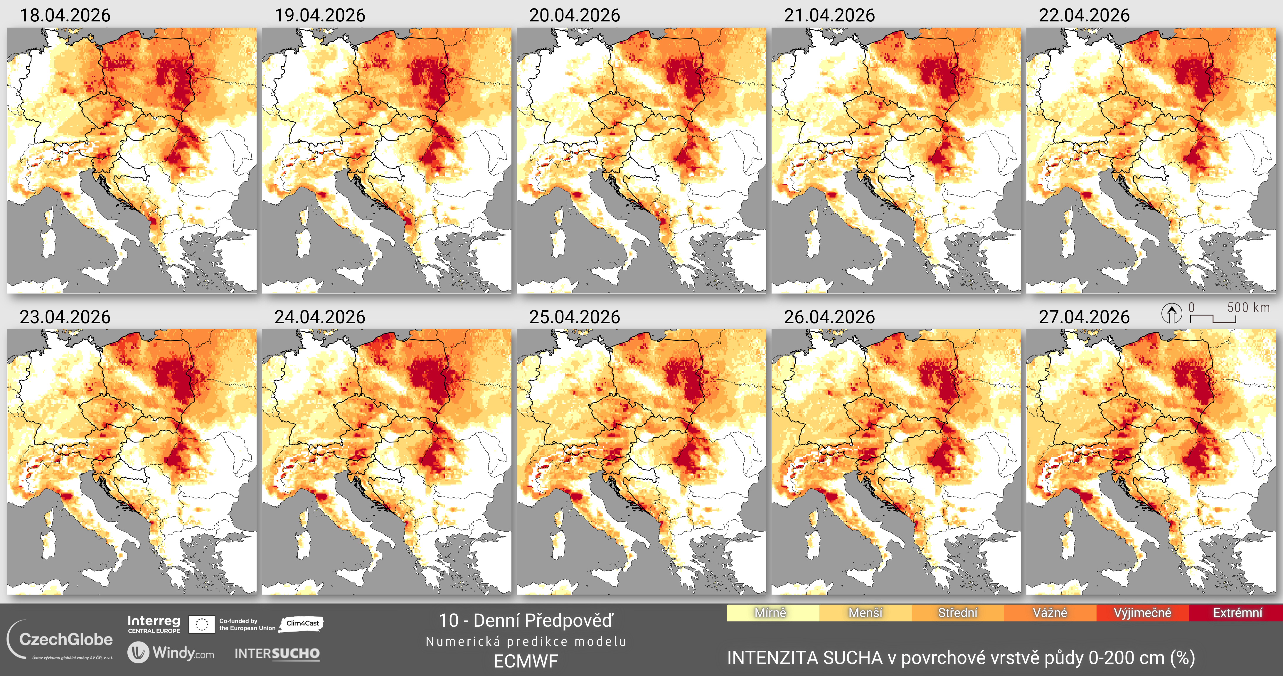 Intenzita sucha je založena na globálně upraveném modelu vodní bilance SoilClim (Řehoř et al., 2021), který vypočítává relativní vlhkost půdy pomocí různých meteorologických vstupů spolu s informacemi o vegetaci a půdě.