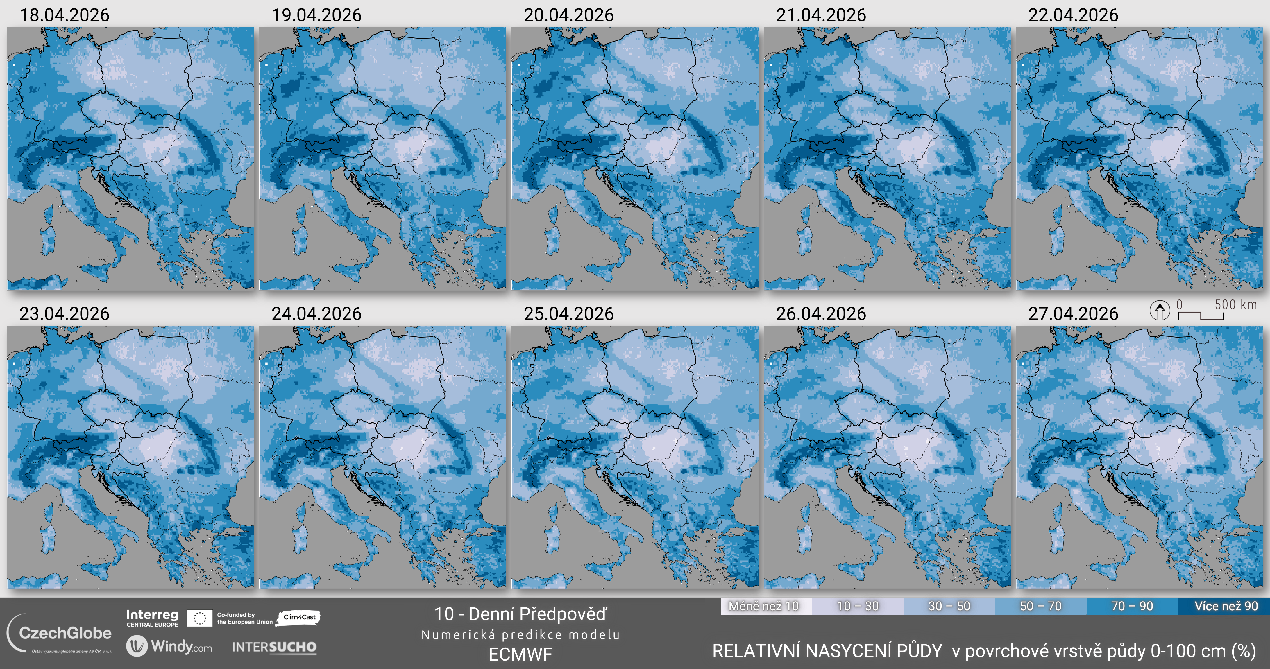 Hodnoty ukazatele se pohybují od 0 % (bod vadnutí) do 100 % (polní kapacita). Údaje o meteorologické předpovědi počasí pocházejí z integrované předpovědi počasí (IFS) Evropského centra pro střednědobou předpověď počasí (ECMWF).