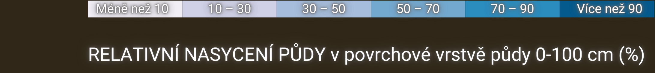 Půdní vlhkost představuje aktuální modelovaný obsah půdní vlhkosti (na základě modelu vodní bilance SoilClIm) vyjádřený jako procento vody dostupné rostlinám, tj. objem vody mezi kapacitou pole a bodem vadnutí.