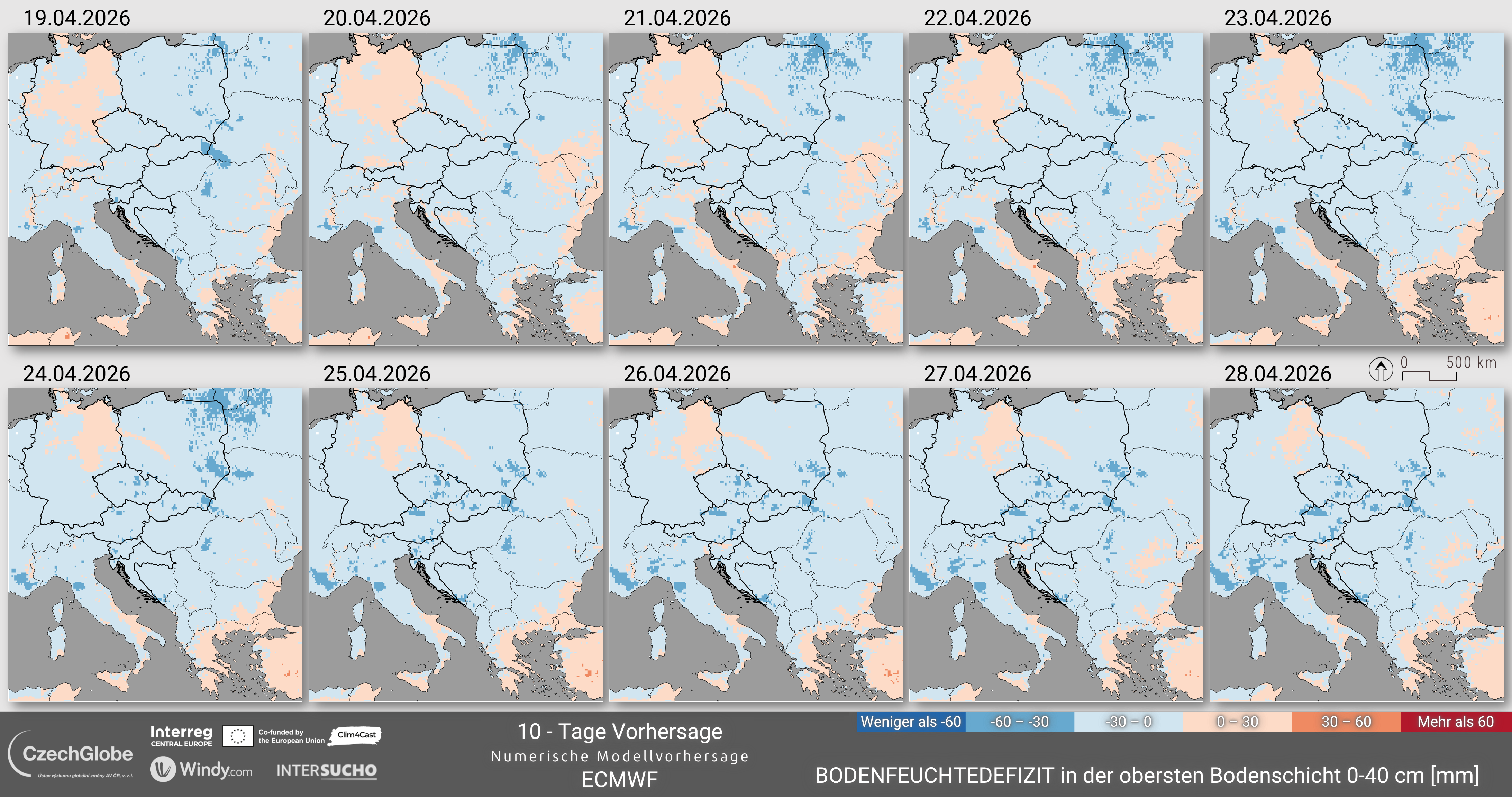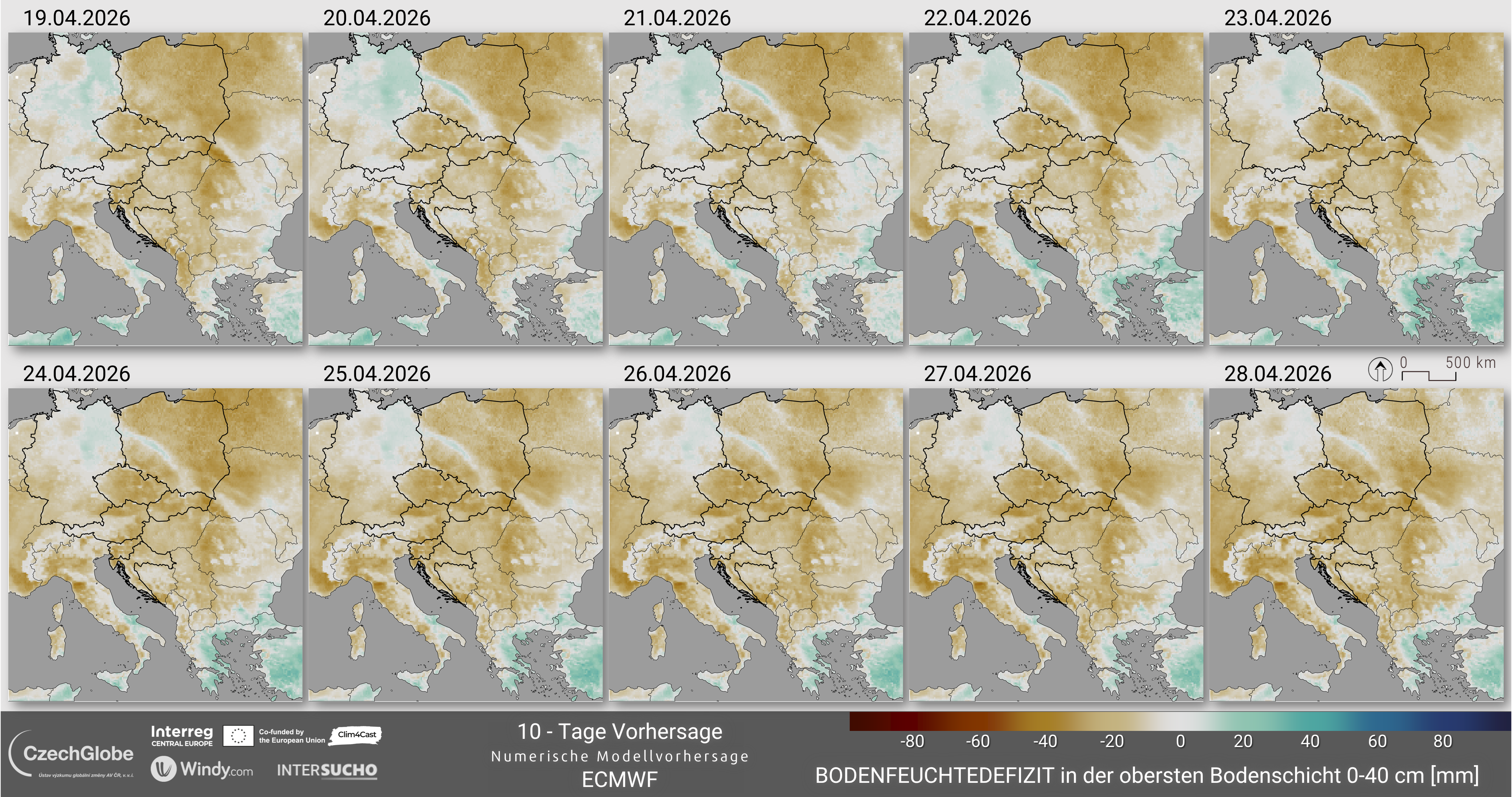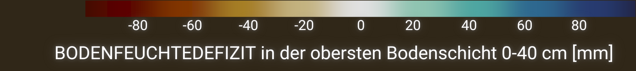 Dieser Wert wird berechnet als der Bodenfeuchtewert für einen bestimmten Tag (+/-10 Tagesfenster, d. h. 21 Tage) abzüglich des aus dem Referenzzeitraum abgeleiteten Wertes des Medians. Die endgültigen Werte werden als Abweichung zur Referenz in der Einheit mm Wassersäule dargestellt. Die meteorologischen Wettervorhersagedaten stammen aus der integrierten Wettervorhersage (IFS) des Europäischen Zentrums für mittelfristige Wettervorhersage (ECMWF).