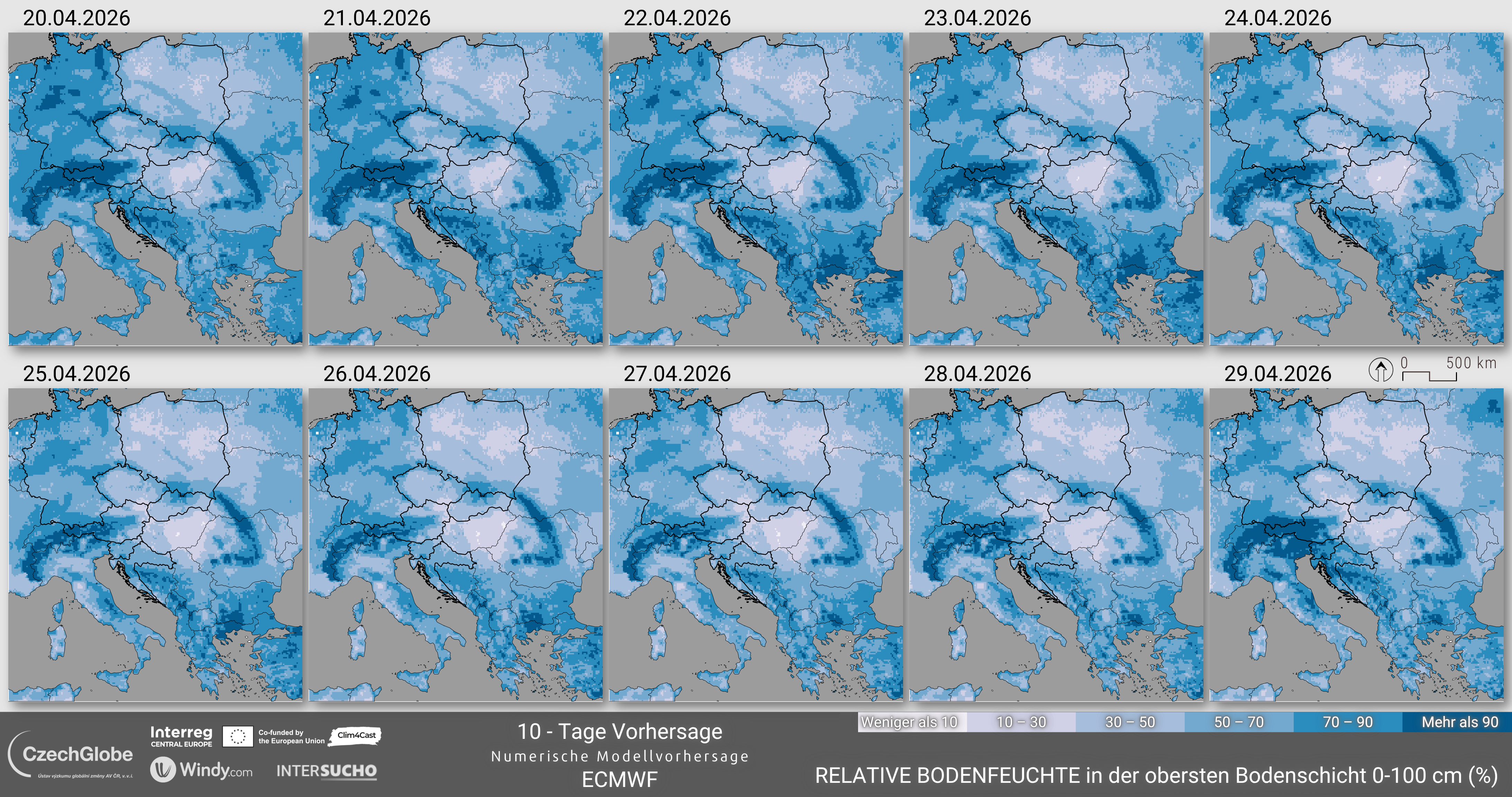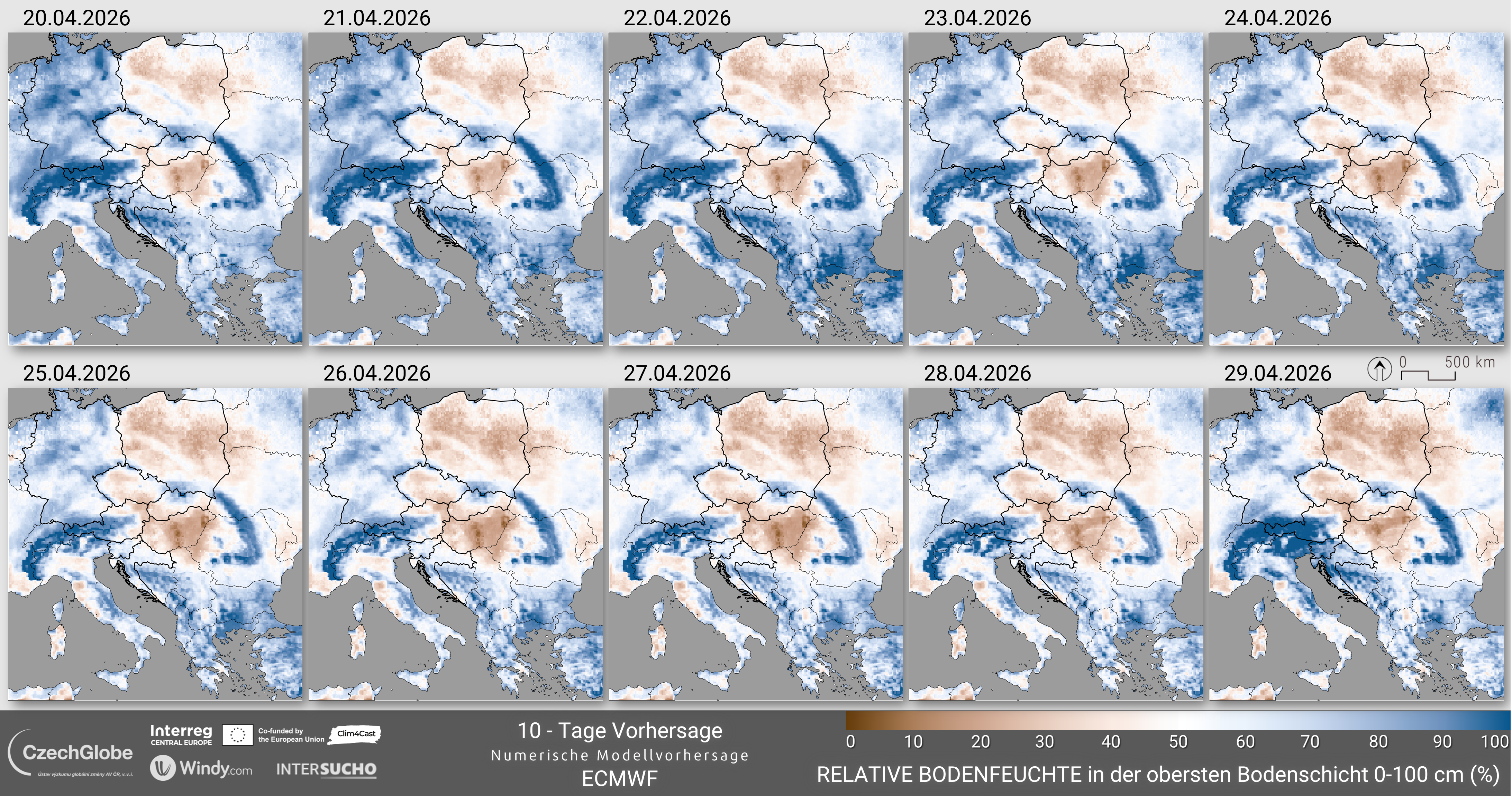 Die Werte des Indikators reichen von 0% (Welkepunkt) bis 100% (Feldkapazität). Die meteorologischen Wettervorhersagedaten stammen aus der integrierten Wettervorhersage (IFS) des Europäischen Zentrums für mittelfristige Wettervorhersage (ECMWF).
