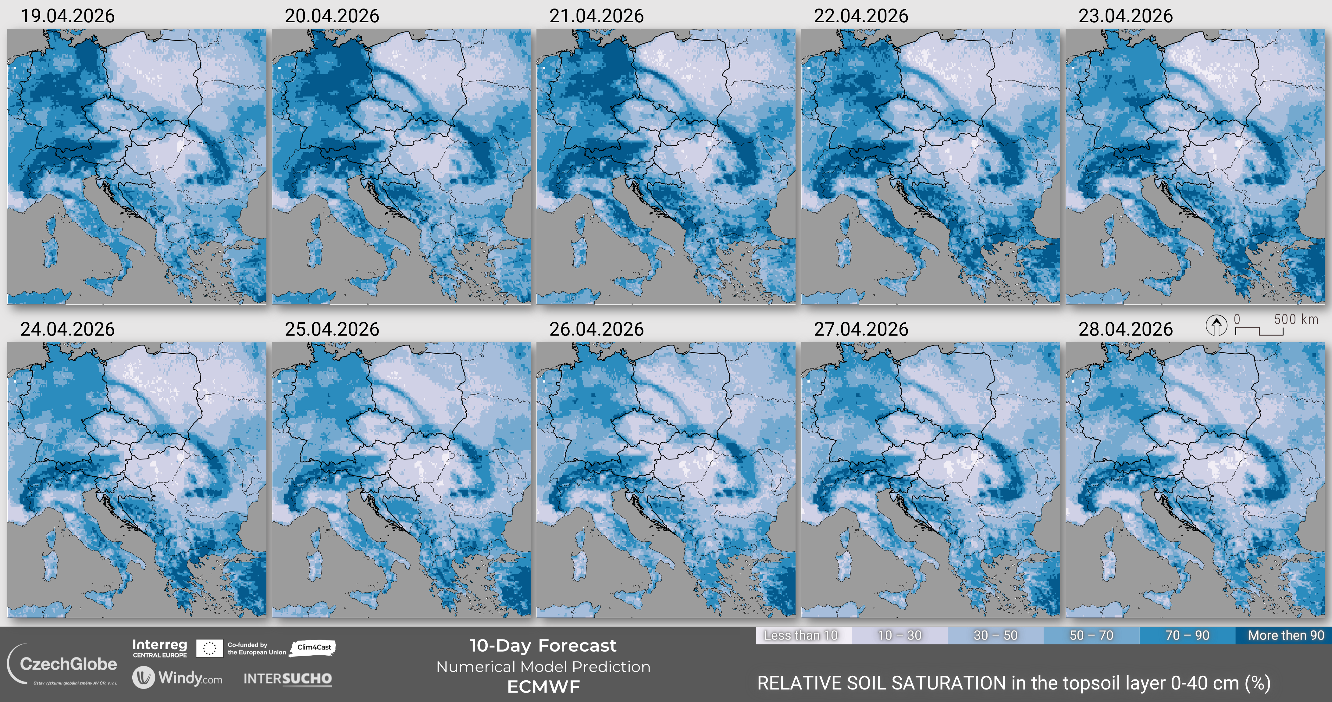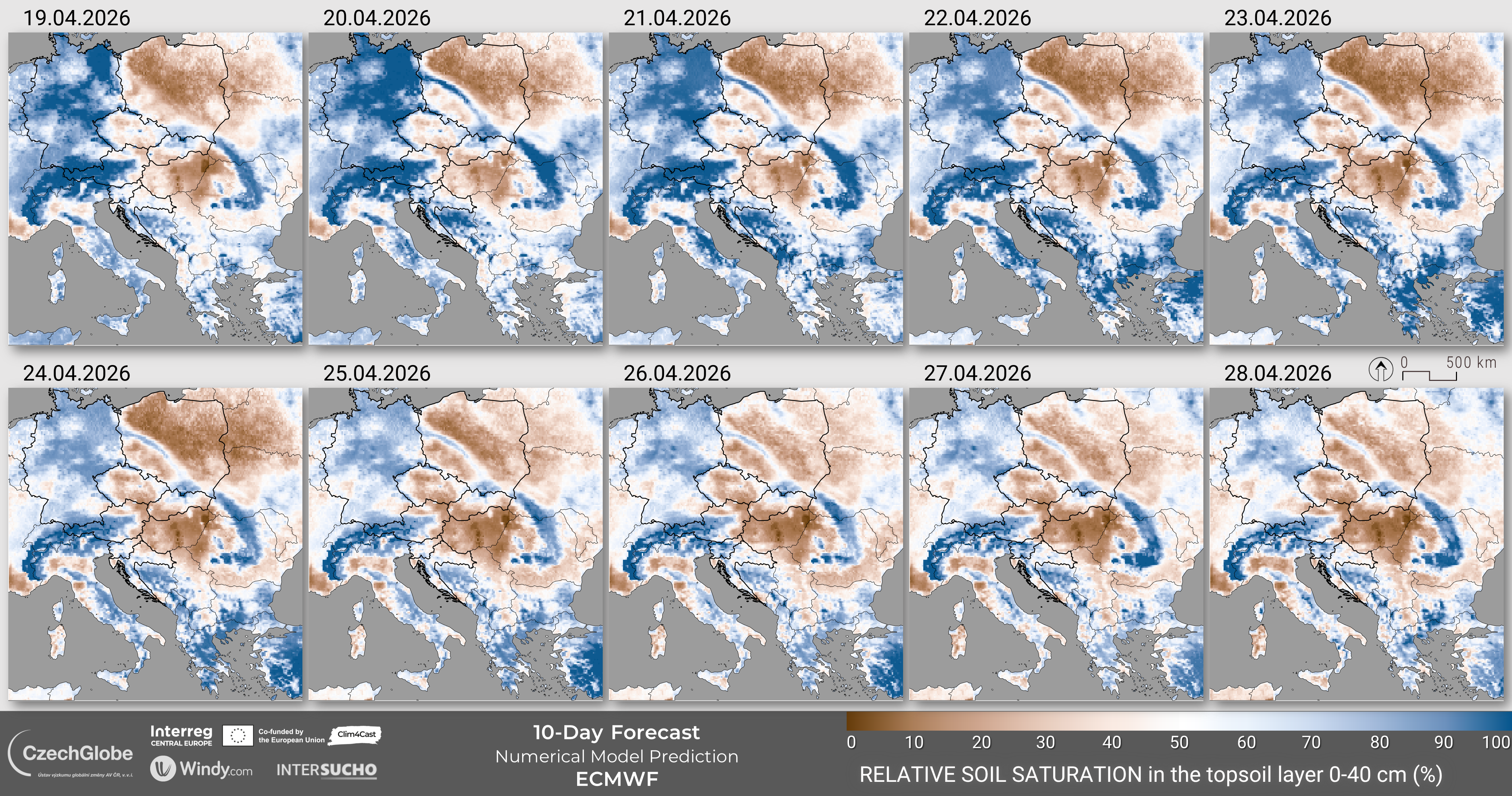 The values of the indicator range form 0% (wilting point) to 100% (field capacity). The meteorological weather forecast data are derived from Integrated Weather Forecast (IFS) by European Center for Medium-range Weather Forecast (ECMWF).
