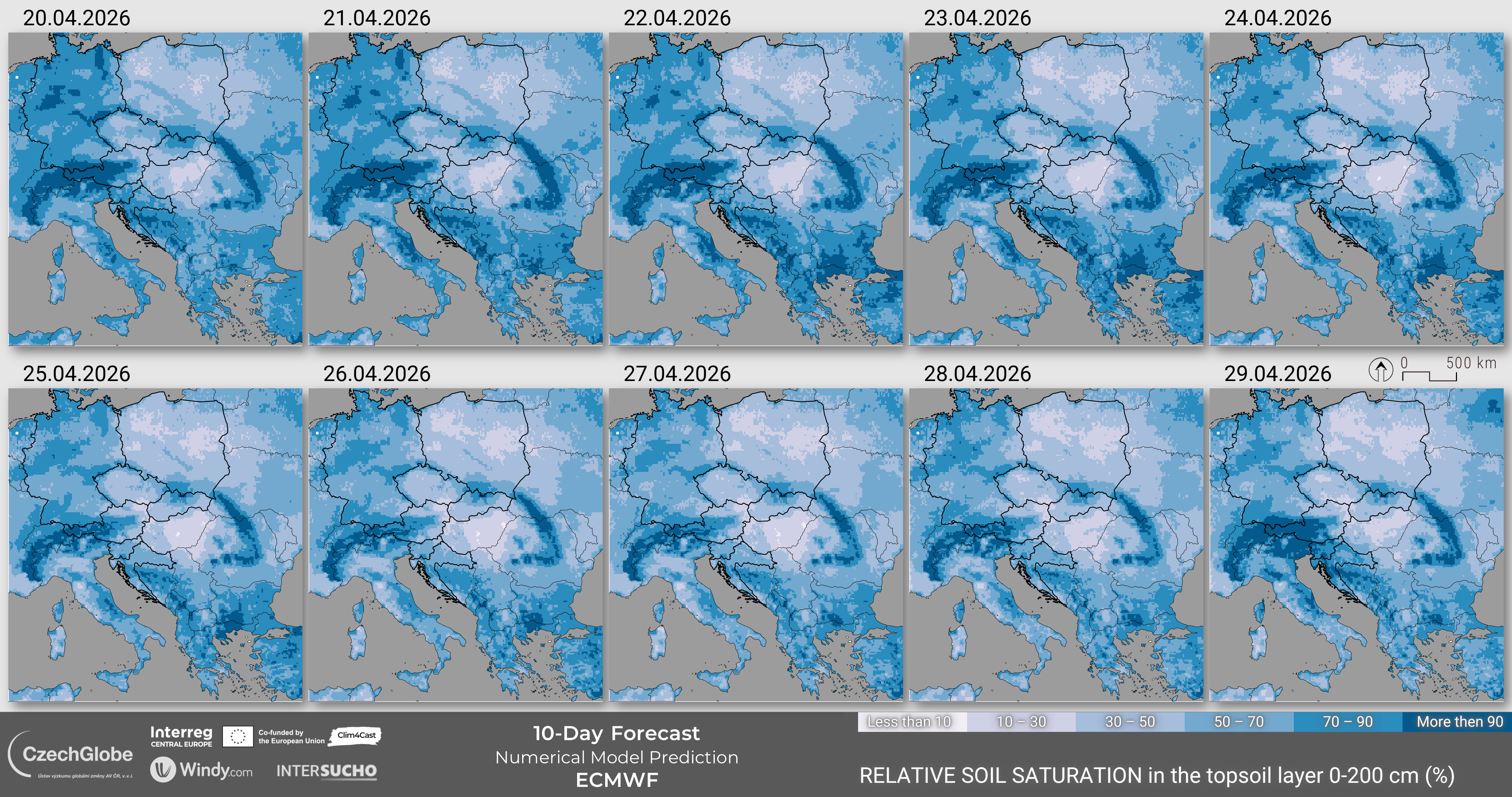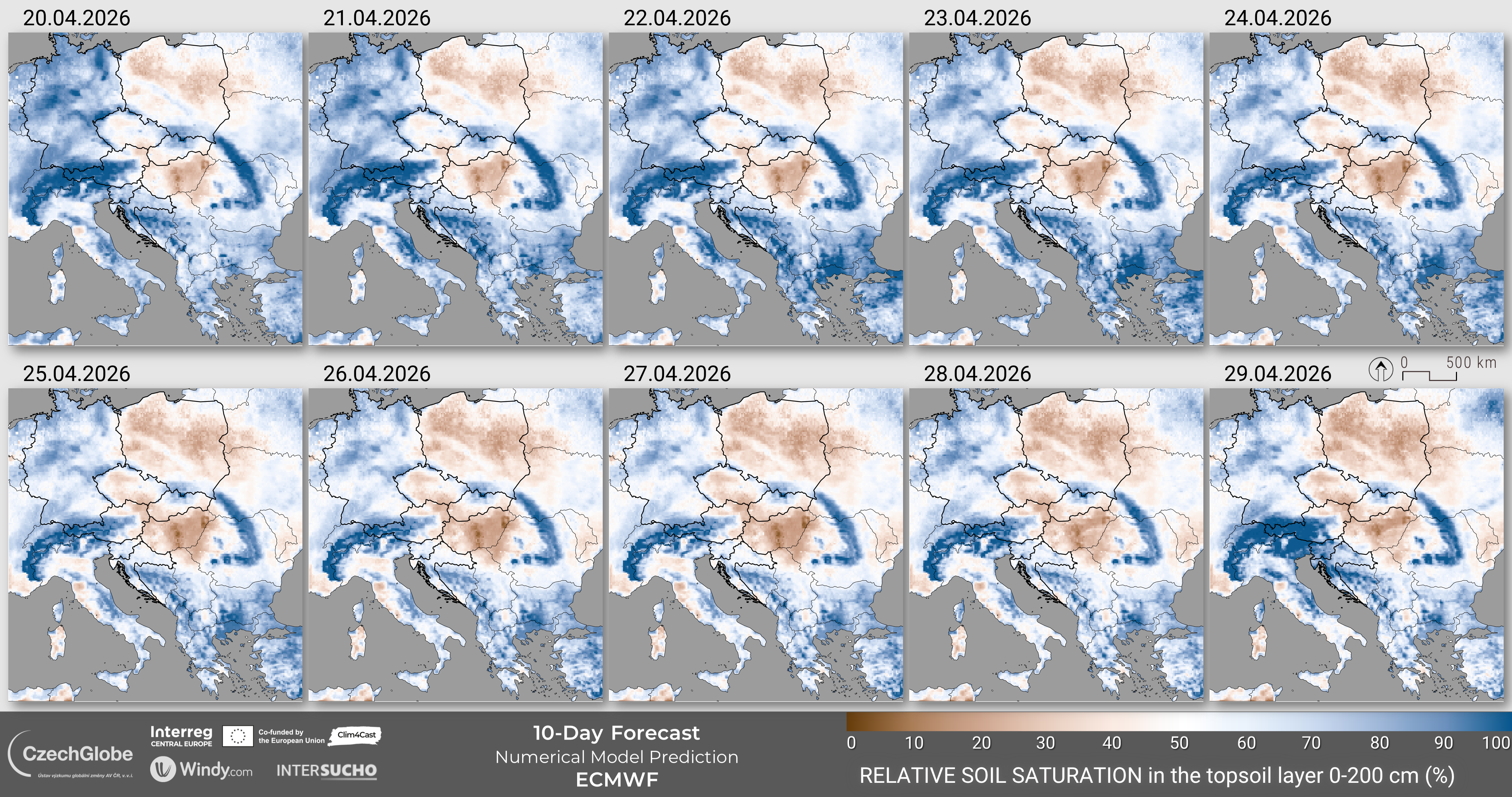 The values of the indicator range form 0% (wilting point) to 100% (field capacity). The meteorological weather forecast data are derived from Integrated Weather Forecast (IFS) by European Center for Medium-range Weather Forecast (ECMWF).