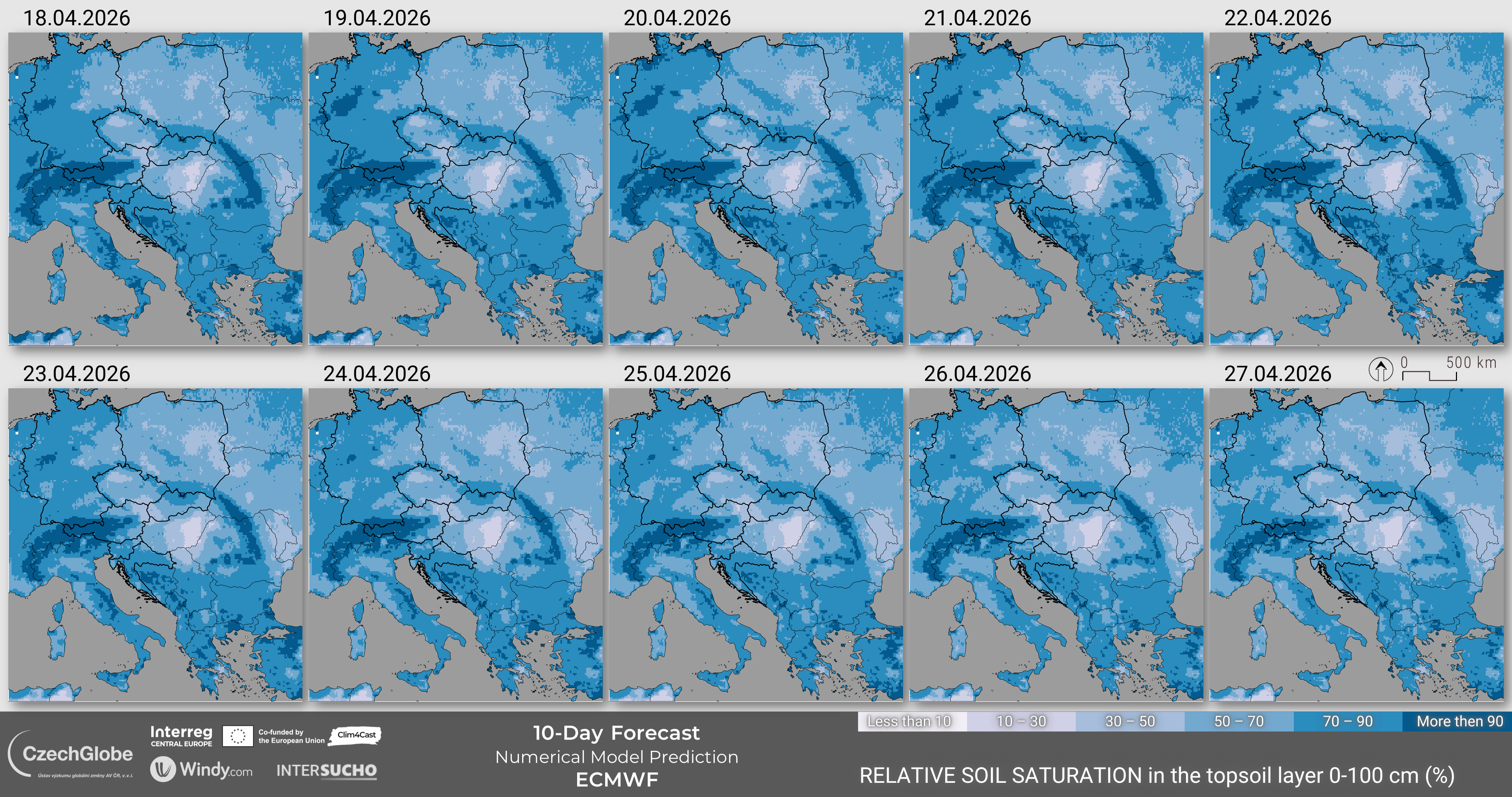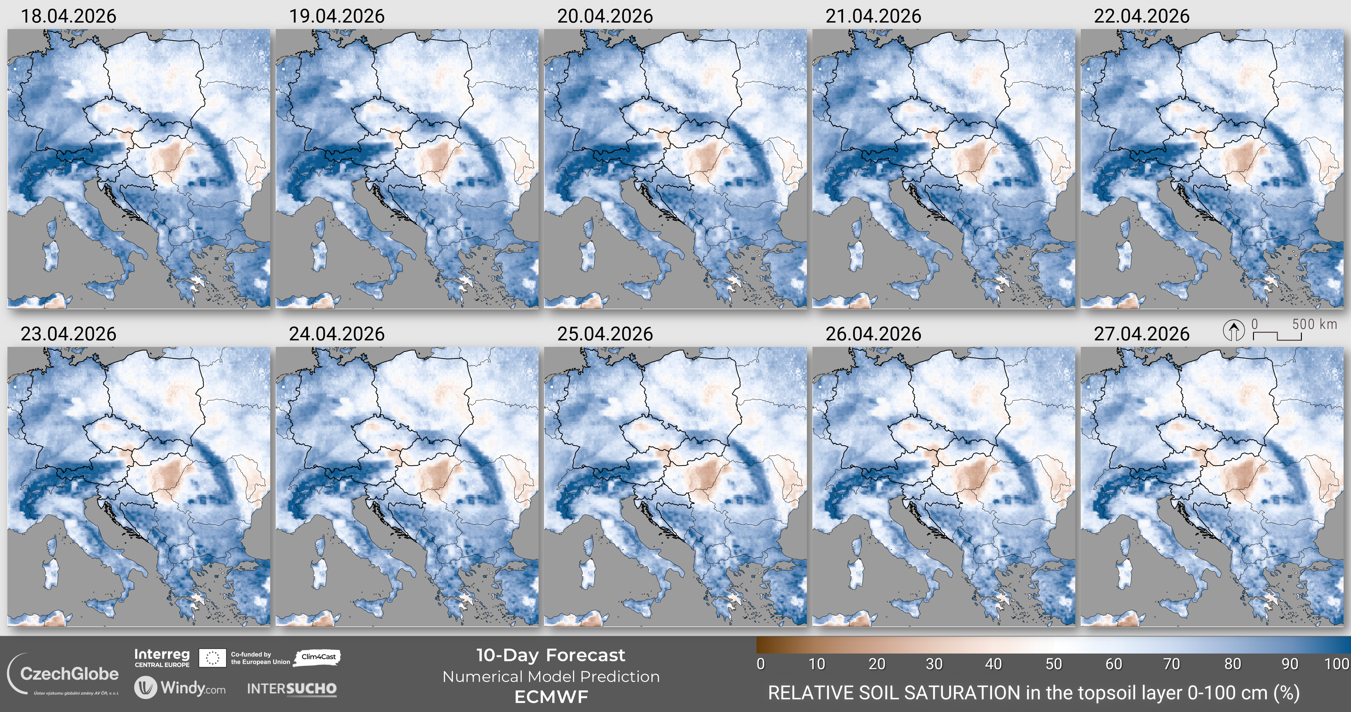 The values of the indicator range form 0% (wilting point) to 100% (field capacity). The meteorological weather forecast data are derived from Integrated Weather Forecast (IFS) by European Center for Medium-range Weather Forecast (ECMWF).