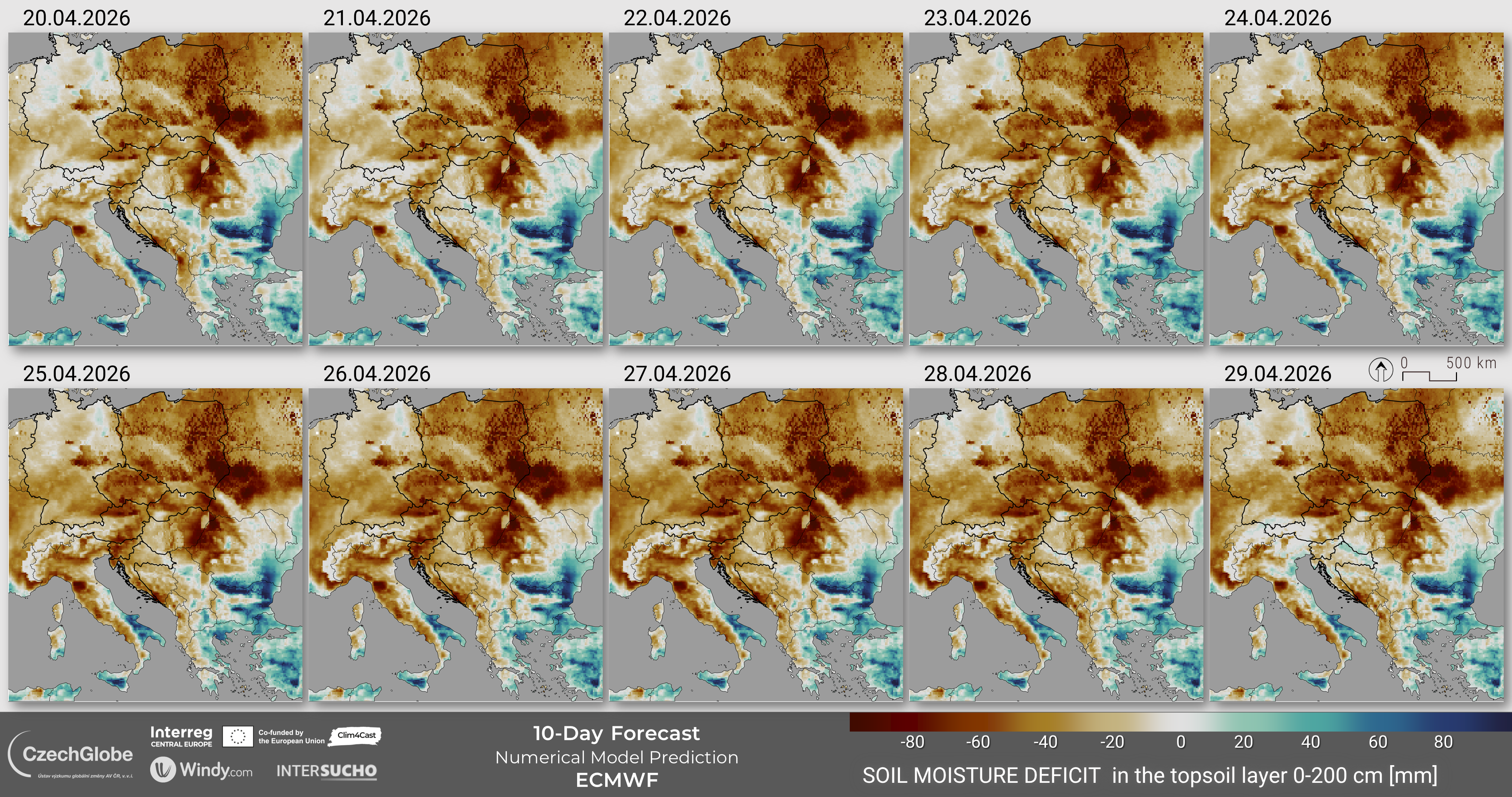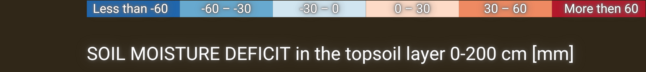Soil moisture anomalies layer (based on SoilClim water balance model) represents deviation of soil moisture content from the long term median of the 1961-2010 reference period.