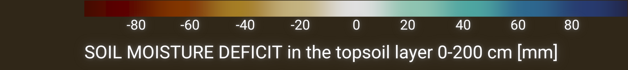 This value is calculated as the Soil moisture value for a given day (+/-10 day window, i.e., 21 days) minus the value of the 50th percentile derived from the reference period. The final values are represented in units of mm as the surplus or deficient height of the water column. The meteorological weather forecast data are stereamlined from Integrated Weather Forecast (IFS) by European Center for Medium-range Weather Forecast (ECMWF).