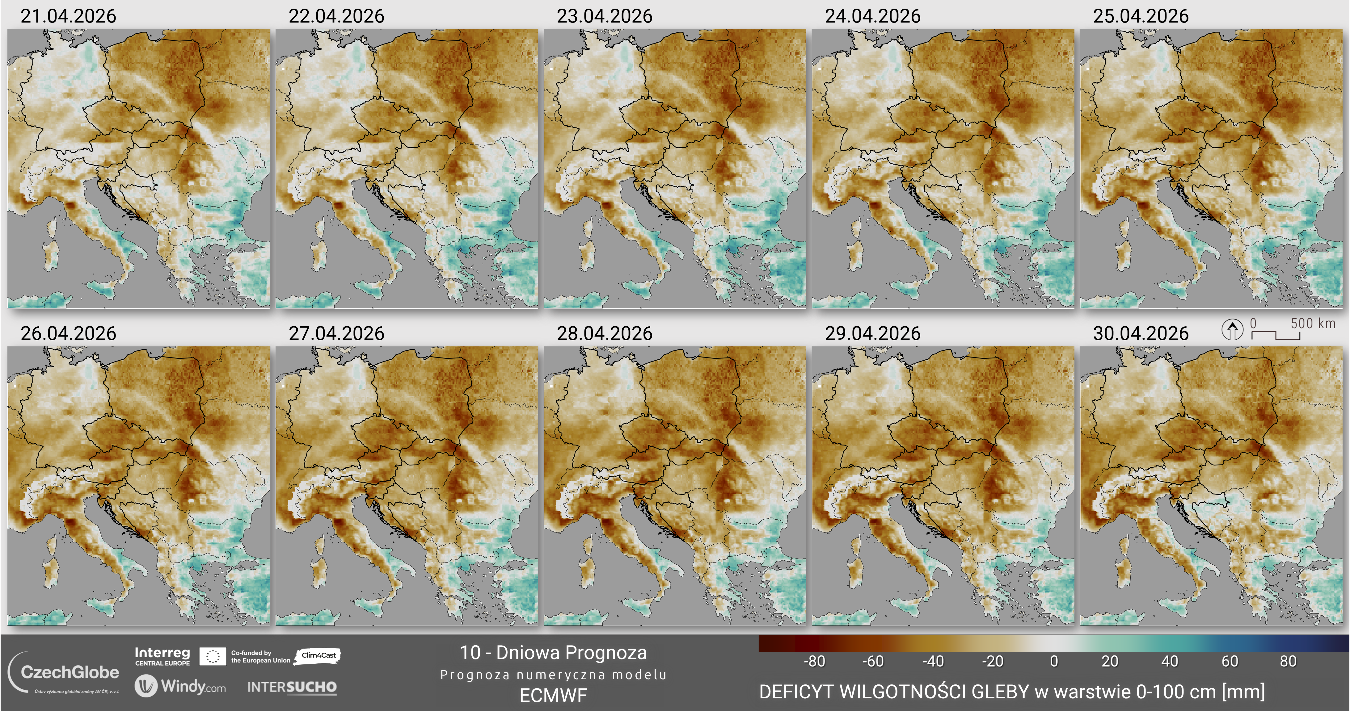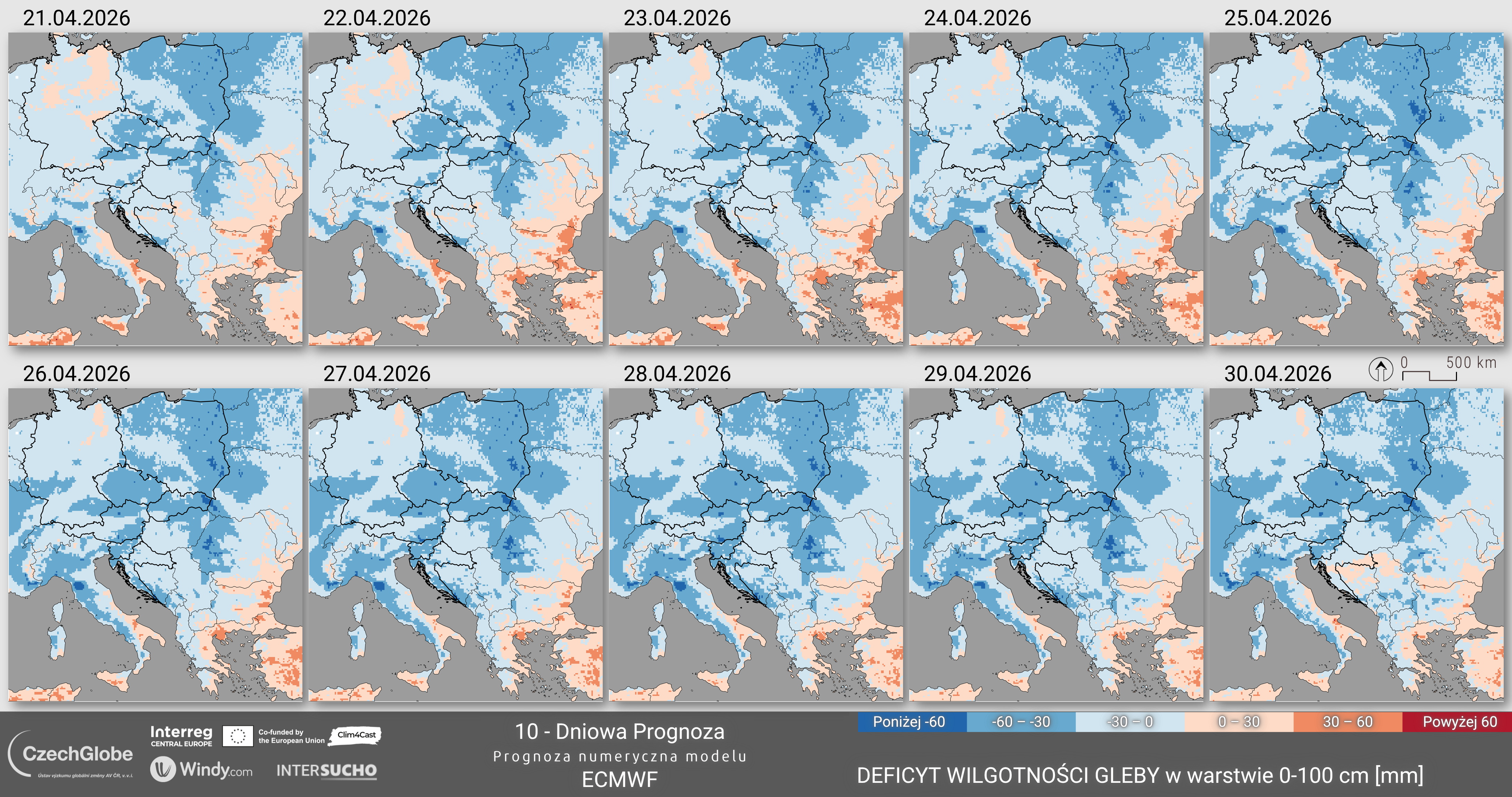Warstwa anomalii wilgotności gleby (oparta na modelu bilansu wodnego SoilClim) przedstawia odchylenie zawartości wody w glebie od długoterminowej mediany dla okresu referencyjnego 1961–2010.