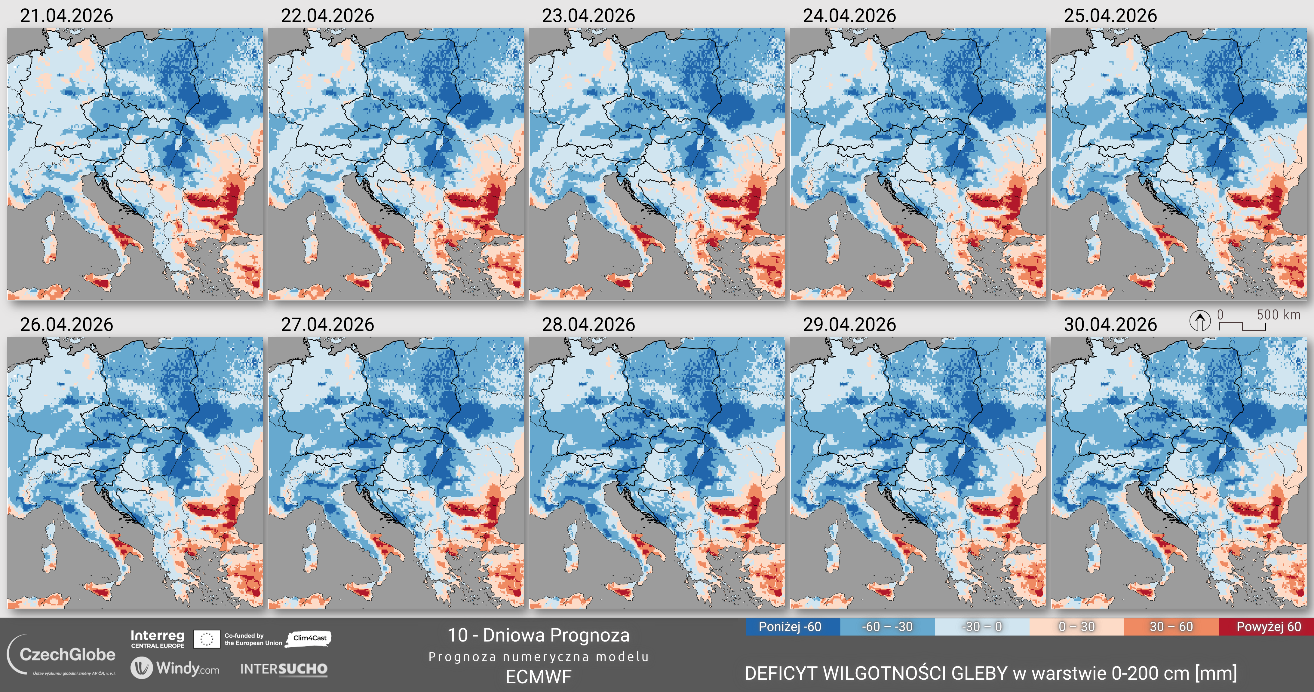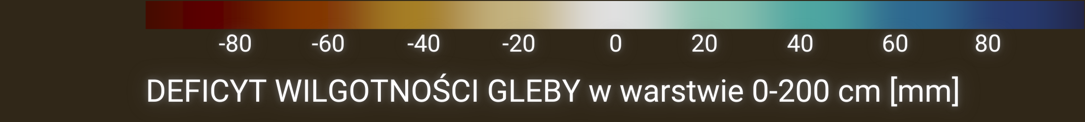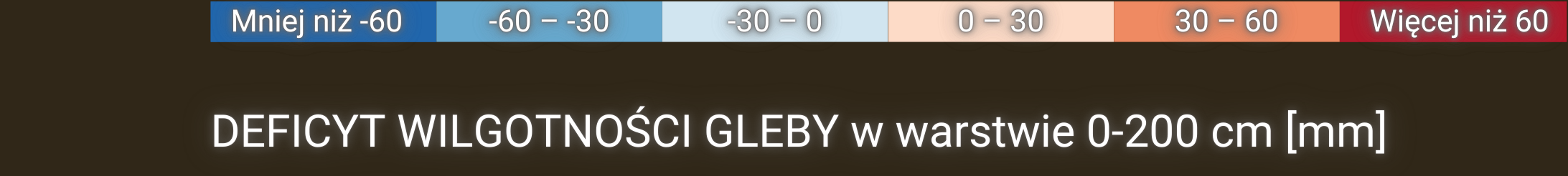 Warstwa anomalii wilgotności gleby (oparta na modelu bilansu wodnego SoilClim) przedstawia odchylenie zawartości wody w glebie od długoterminowej mediany dla okresu referencyjnego 1961–2010.