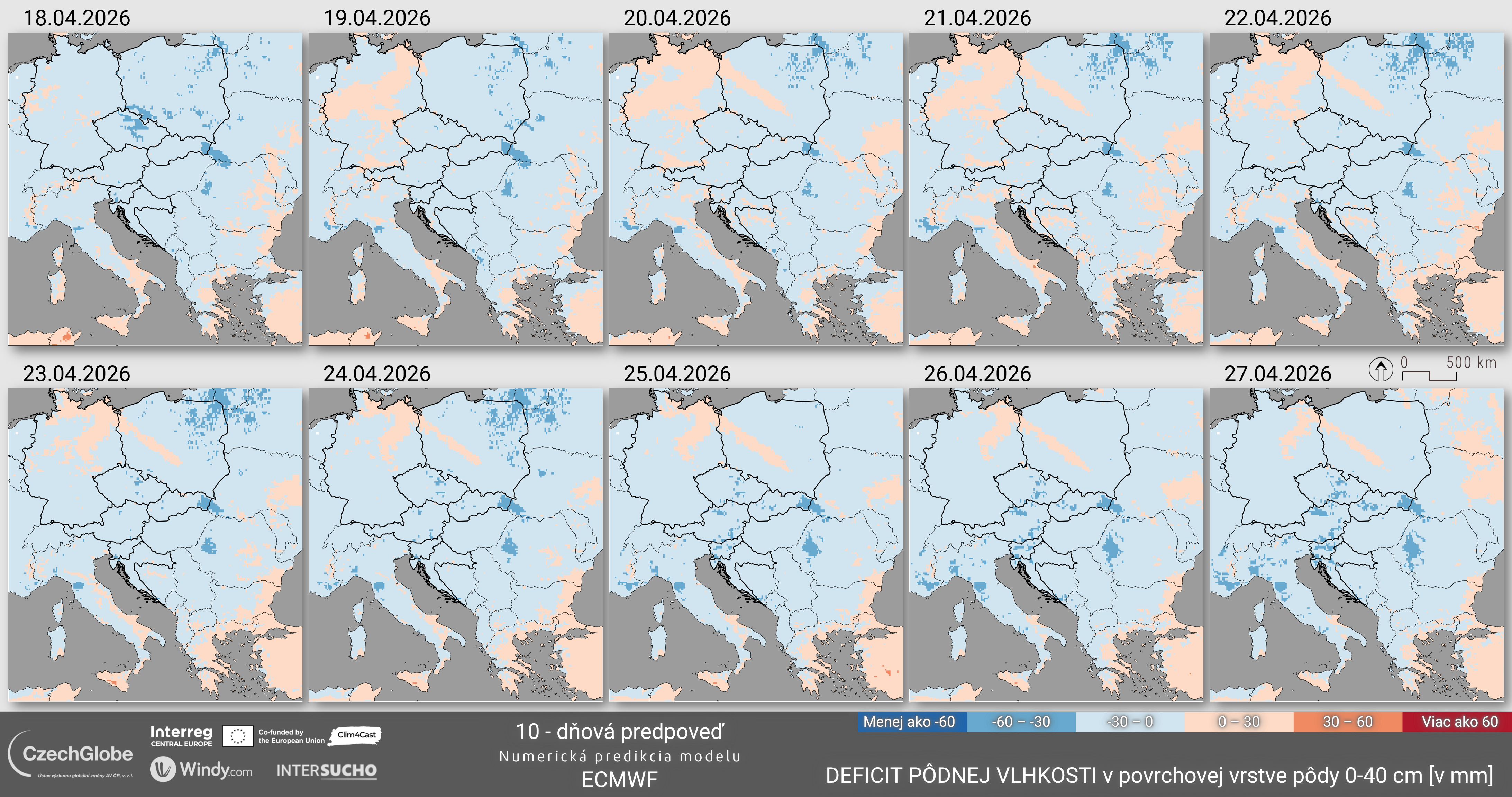 Táto hodnota sa vypočíta ako hodnota vlhkosti pôdy pre daný deň (+/-10-dňové okno, t.j. 21 dní) mínus hodnota mediánu odvodená z referenčného obdobia. Výsledné hodnoty sú reprezentované v mm ako prebytok alebo nedostatok výšky vodného stĺpca v pôde. Meteorologické údaje sú zjednodušené z Integrovaných predpovedí počasia (IFS) Európskeho centra pre strednodobé predpovede počasia (ECMWF).