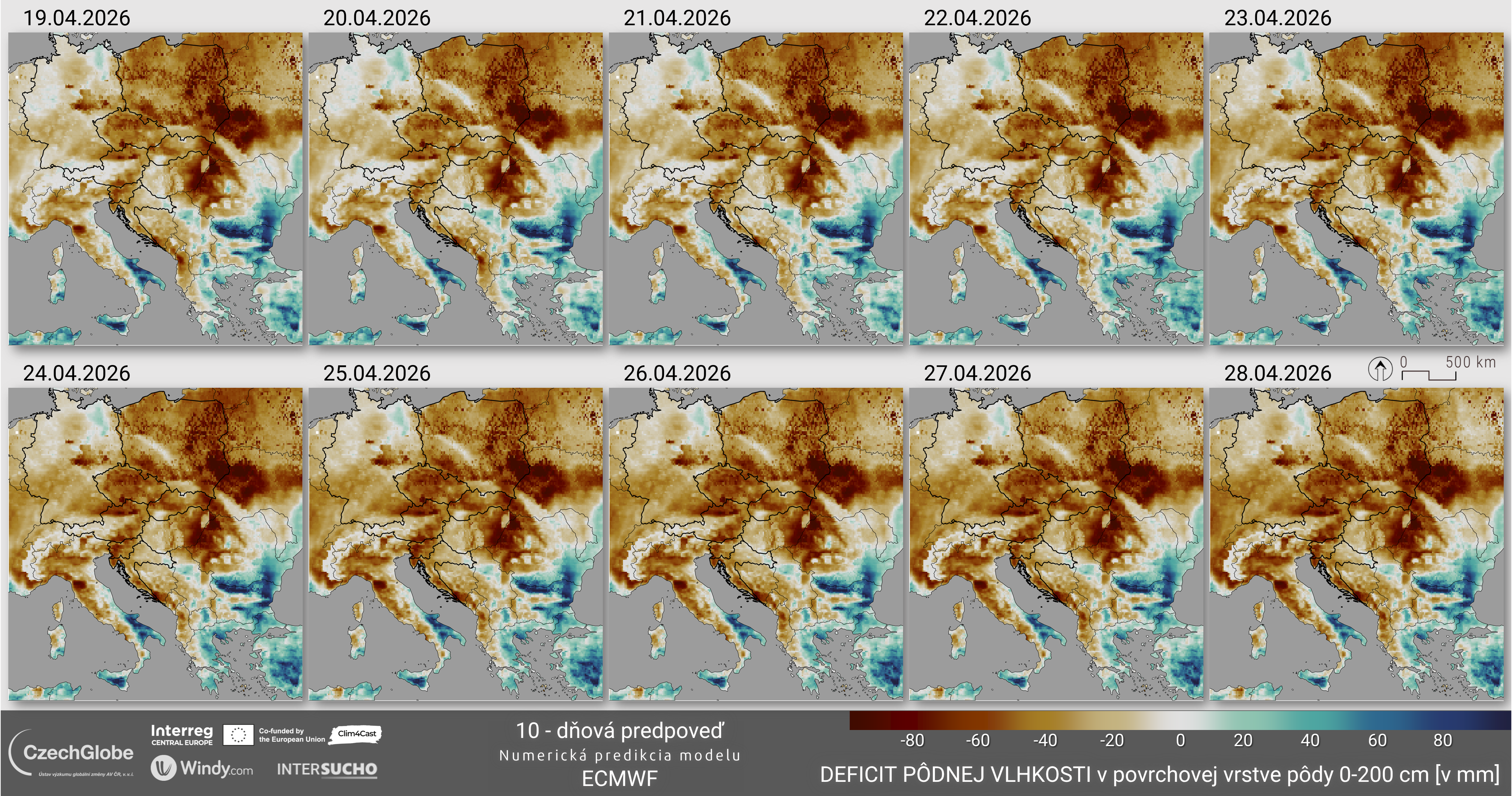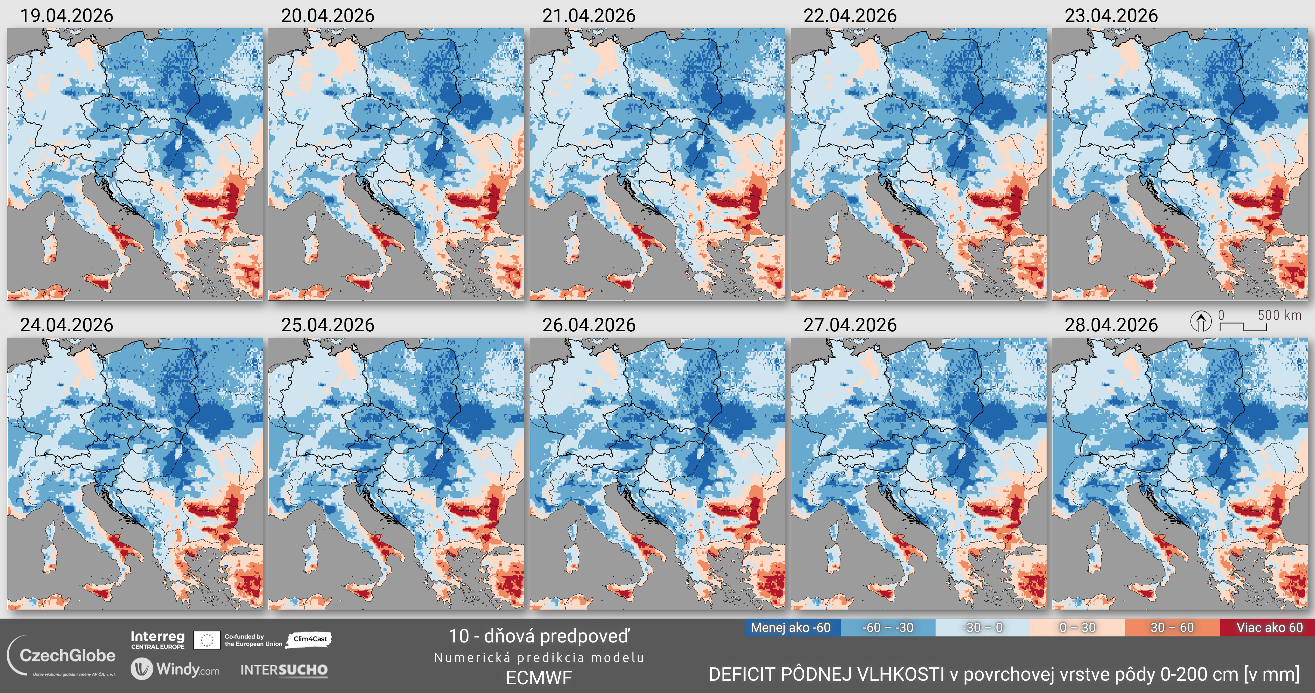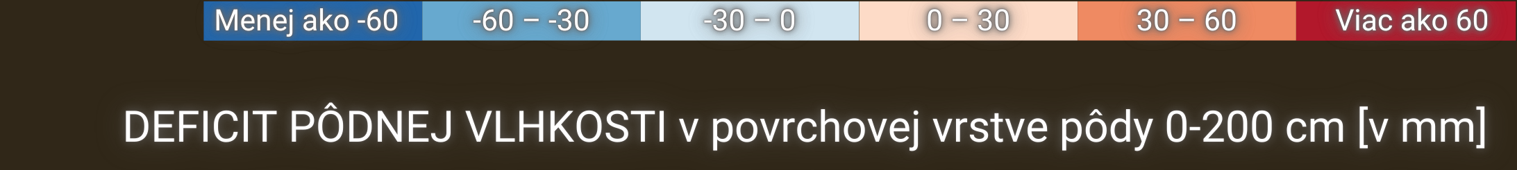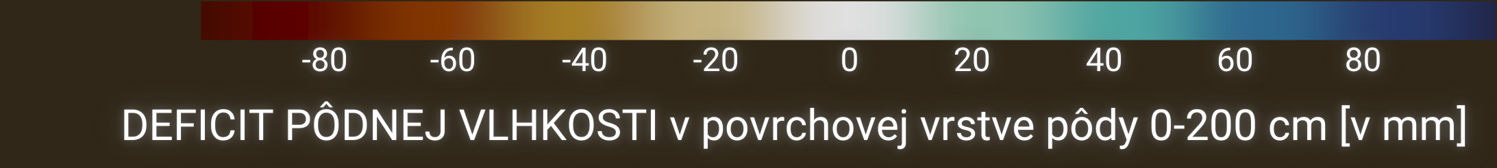Vrstva anomálií pôdnej vlhkosti (na základe modelu vodnej bilancie SoilClim) predstavuje odchýlku pôdnej vlhkosti od dlhodobého mediánu referenčného obdobia 1961–2010.