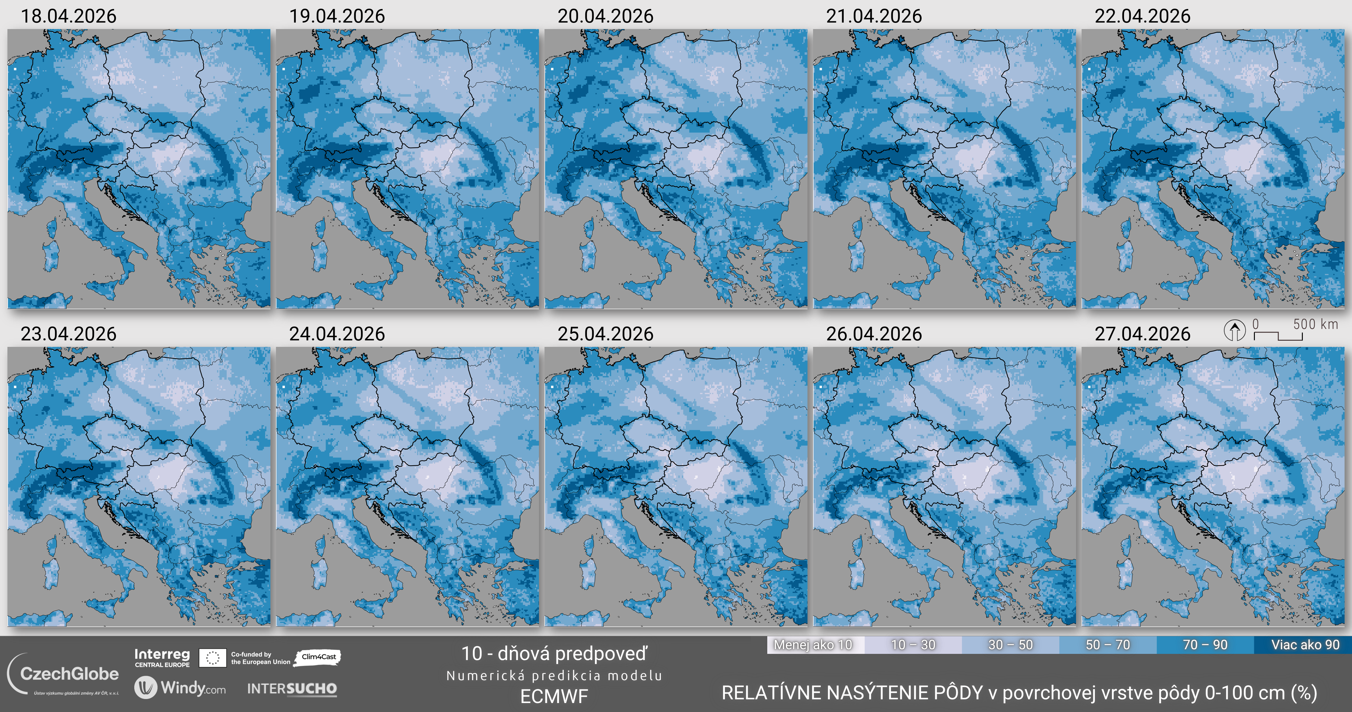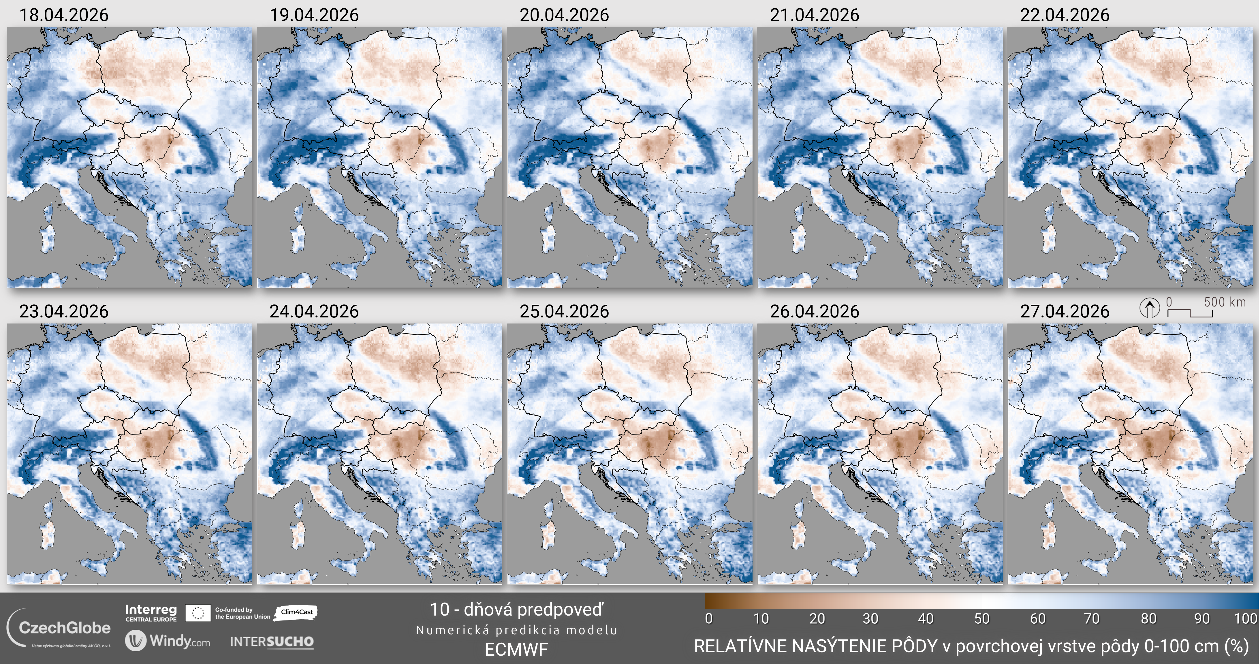 Hodnoty ukazovateľa sa pohybujú od 0 % (bod vädnutia) do 100 % (plná poľná kapacita). Údaje o meteorologickej predpovedi počasia pochádzajú z integrovaných predpovedí počasia (IFS) Európskeho centra pre strednodobé predpovede počasia (ECMWF).