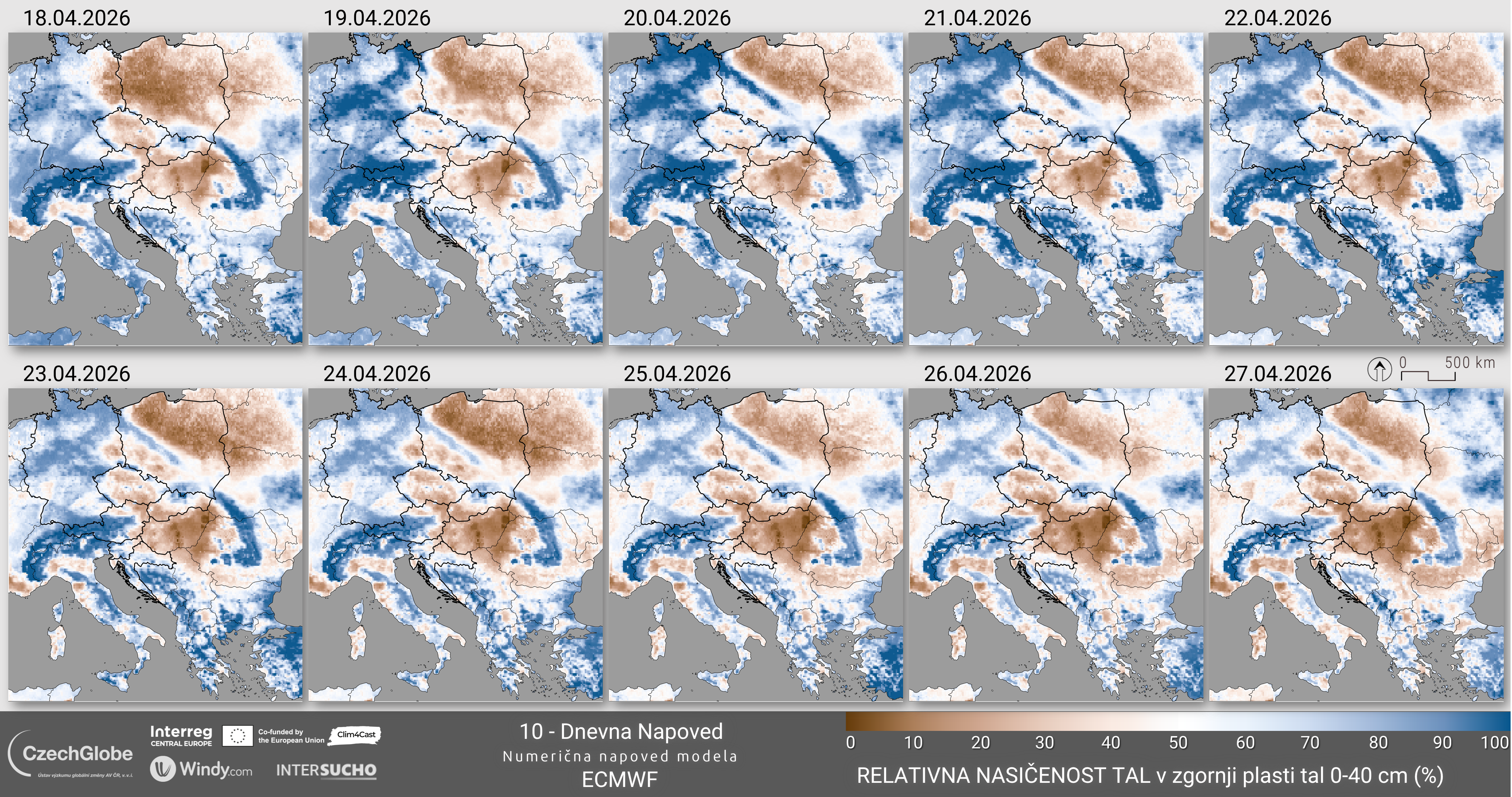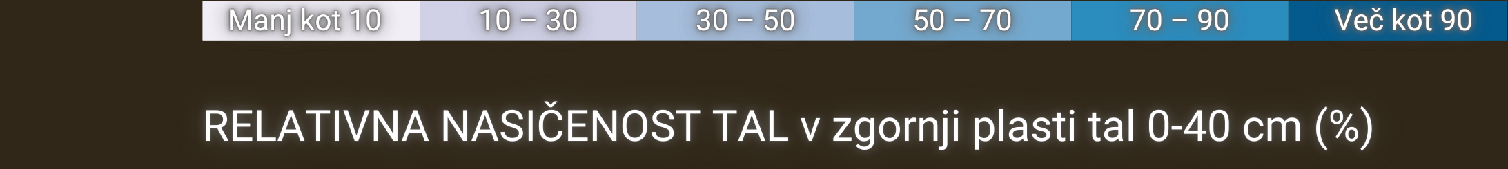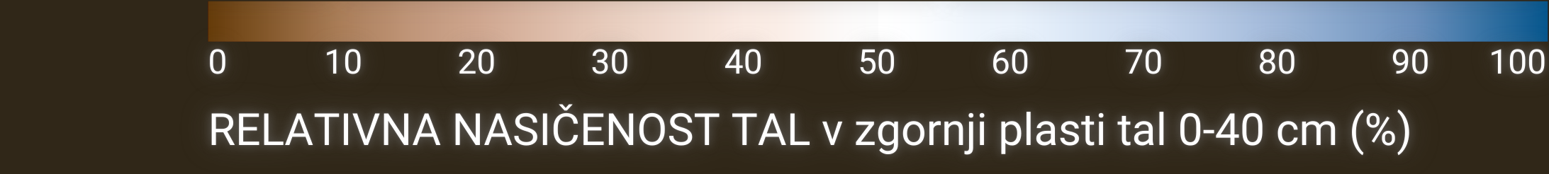 Vrednosti kazalnika so od 0 % (točka venenja) do 100 % (poljska kapaciteta). Podatki meteorološke vremenske napovedi izhajajo iz numerične vremenske napovedi (IFS) Evropskega centra za srednjeročno vremensko napoved (ECMWF).