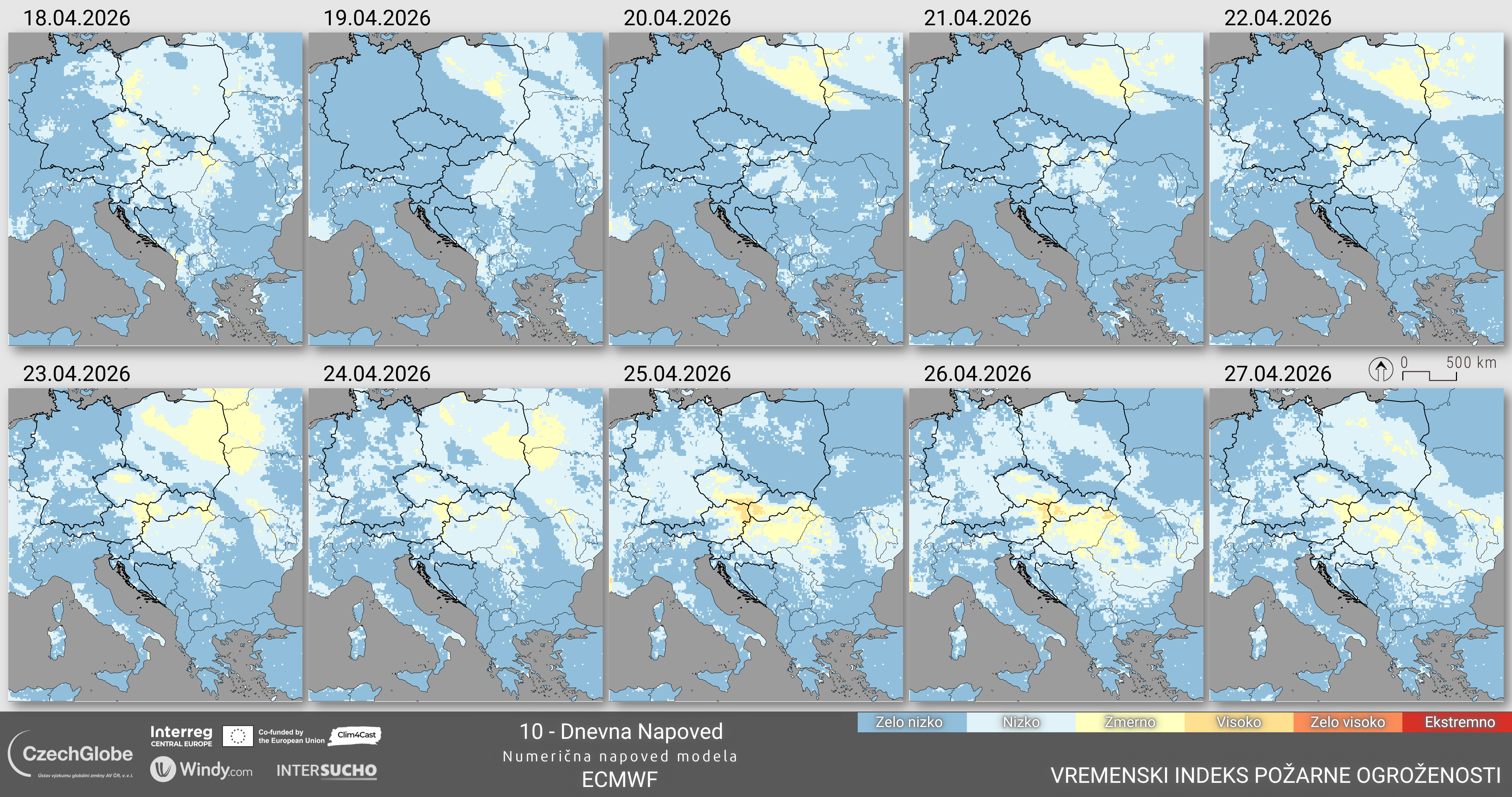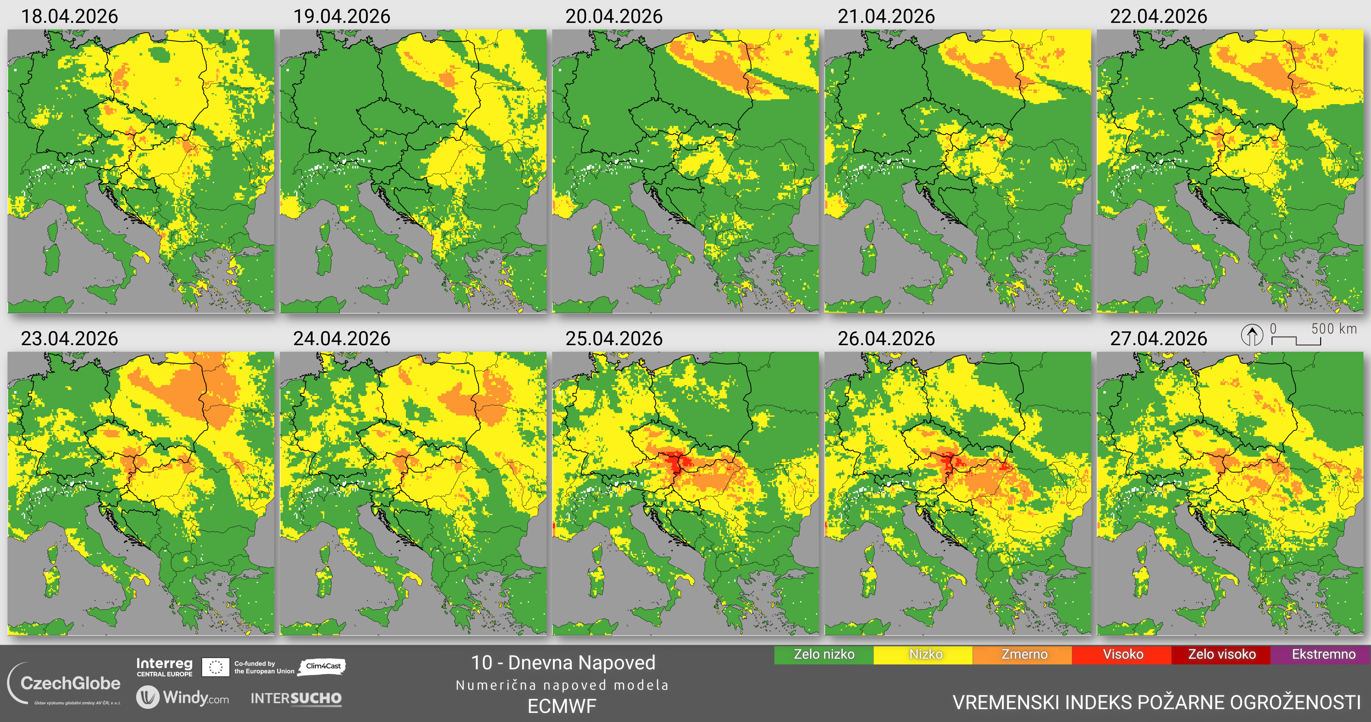 Iin temelji na kanadskem indeksu požarnega vremena (FWI, Wagner, 1987), izračunanem iz temperature, relativne vlažnosti, vetra in padavin za danes in naslednjih devet dni na podlagi podatkov vremenske napovedi IFS ECMWF. Ker se srednja vrednost in amplituda FWI razlikujeta glede na lokalno vegetacijo in podnebje, so bile določene mejne vrednosti izpeljane za 18 svetovnih okoljskih območij. Vsakemu okoljskemu območju je bila dodeljena edinstvena porazdelitev vrednosti FWI za kategorije požarne ogroženosti, ki so bile določene na podlagi obsežnega pregleda znanstvene literature (Kudláčková et al., 2025).